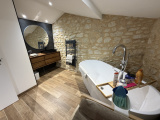 À l’étage, vous trouverez 2 chambres et une grande salle de bain mixte (baignoire + douche) avec WC.