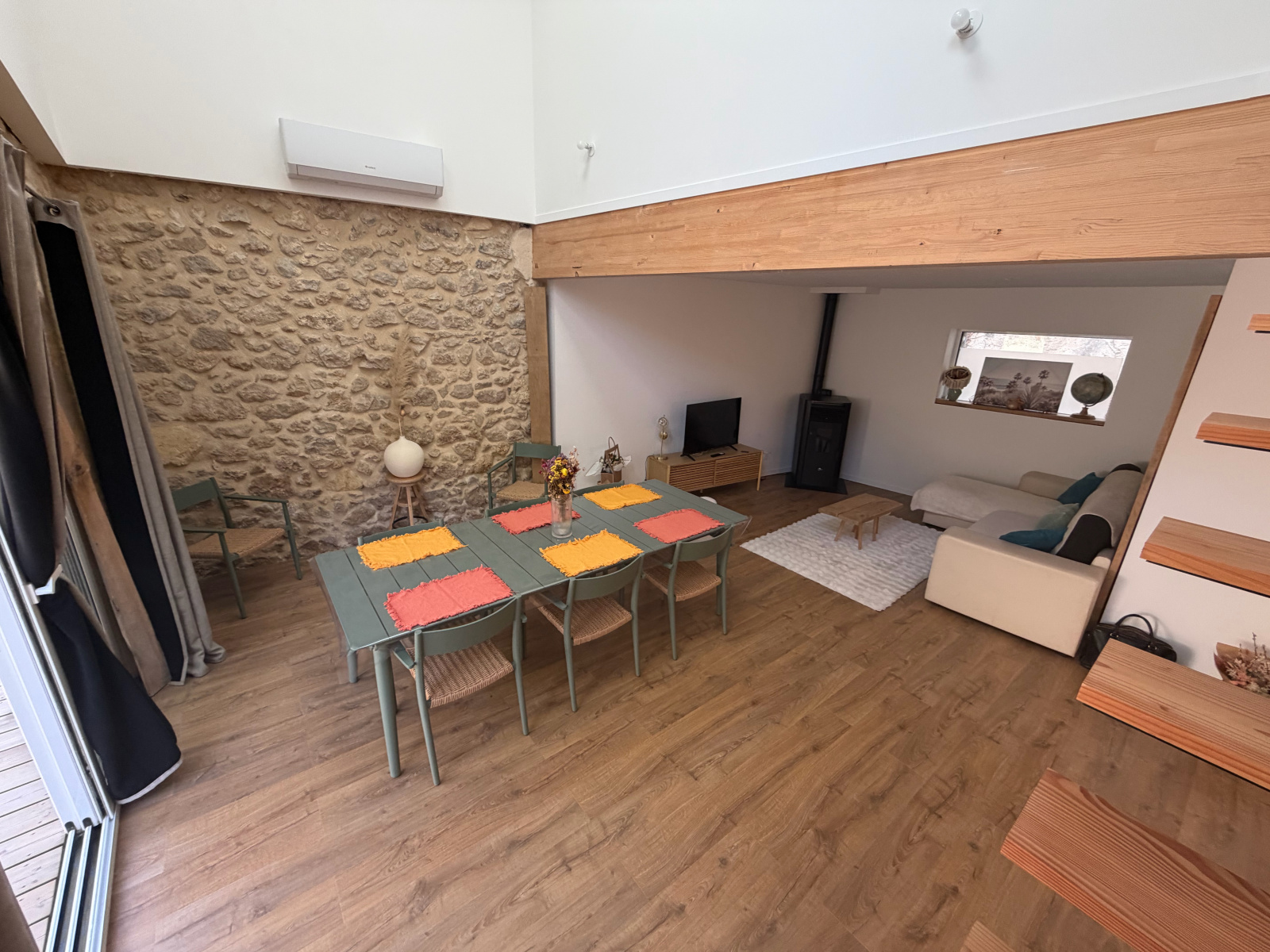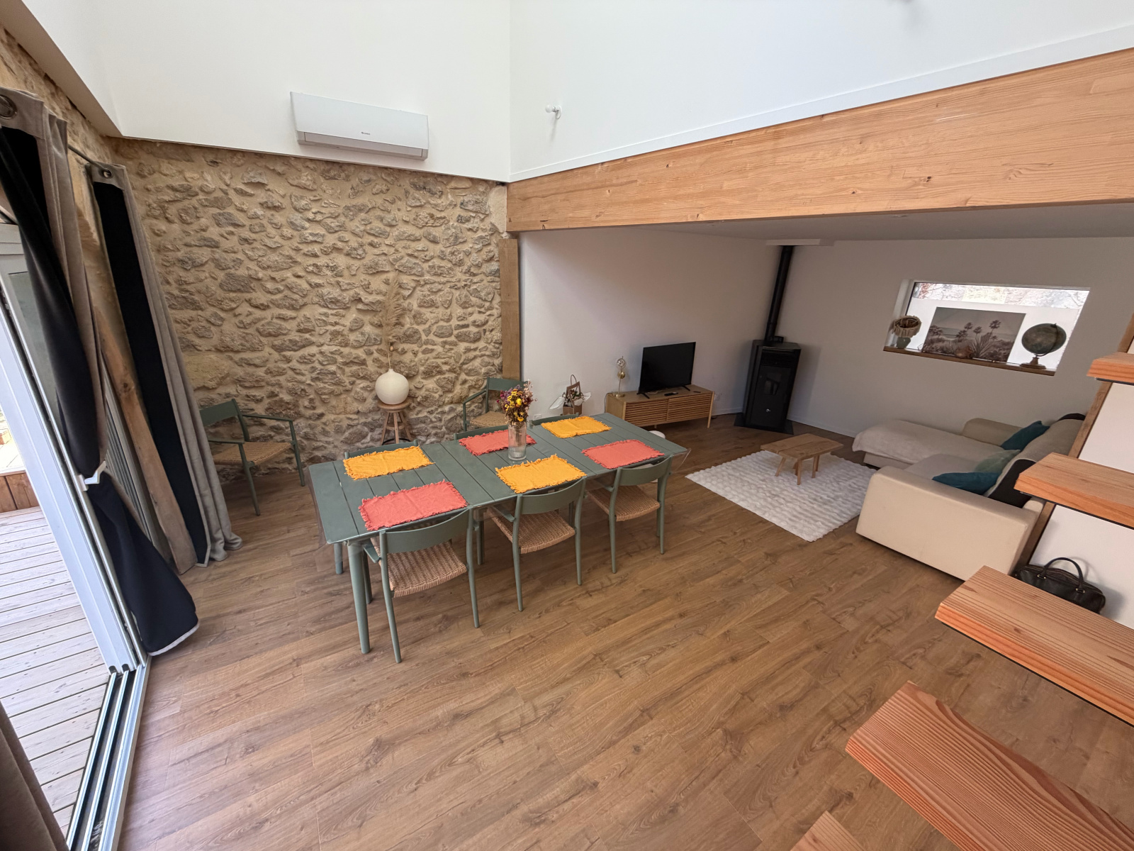 Confort assuré grâce à la climatisation réversible et au poêle à granulés.